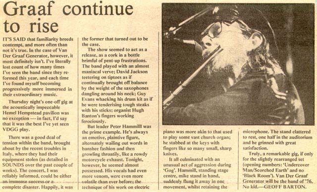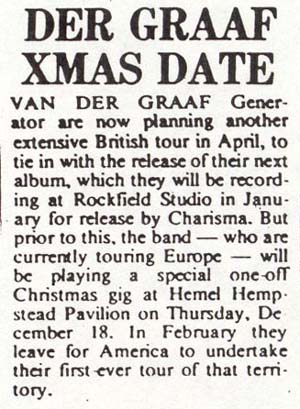 | I remember just before Christmas somewhere in Germany, we were given backstage passes shaped like big yellow triangles - really quite striking - and on them it said 'VdGG - Farewell'... the support band were called 'Farewell'. I thought, how strange! This would be a weird last gig to do in, in Stuttgart! I've still got the pass in a box somewhere because it did turn out to be just that, the last Van der Graaf Generator gig I ever did. Just after Christmas Hugh left the band. We brought in Graham Smith (ex-violinist with String Driven Thing) and Nic Potter came back on bass, we spent a week rehearsing but I found the situation insurmountable. I just couldn't see how it could work. At the end of that week I resigned. I thought if I left now it would help the reformation, me being there with a broken heart would not help it. My spirit had gone, the two years and all the problems had wiped it away. I didn't want to be away from home. I had a little baby, 9 months spent touring that year didn't seem to be a thing I wanted to do. | |||