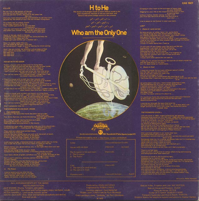 Killer - "The original song was called 'A Cloud As Big As A Man's Hand'. It was co-written by me and an old school friend, John 'Stephen' Ward, who was not a member of Heebalob. I wrote all the lyrics, and I also wrote the music for the central section which later surfaced in 'Killer'. It was one of my very first 'good' tunes. We used to do the song as part of Heebalob's stage set."