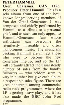 | "...can only appeal to Hammill/Generator fans whose enthusiasm can overcome the relentlessly miserable and often monotonous music." - Review (unknown origin) | ||||||||||||