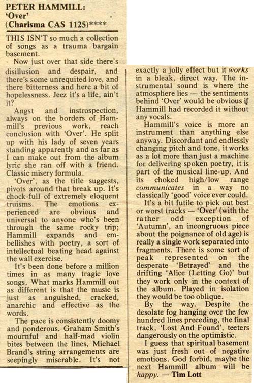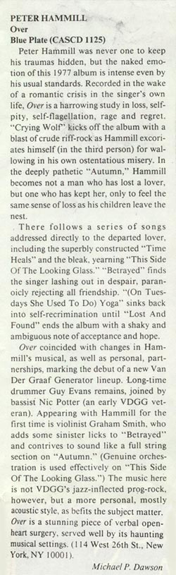 | "Over is a stunning piece of verbal open-heart surgery, served well by its haunting musical settings." - Review of the CD in Goldmine (Michael P. Dawson, 7th March 1992) |