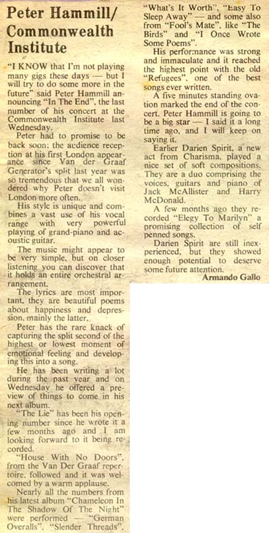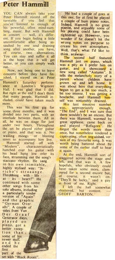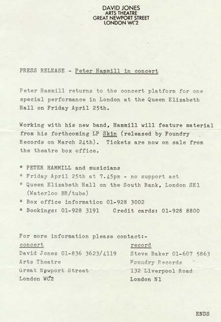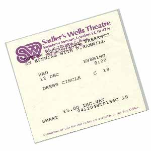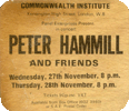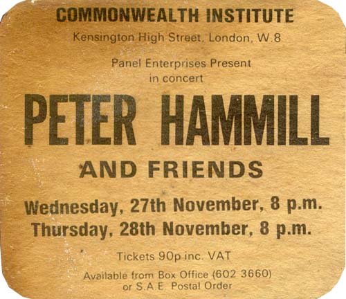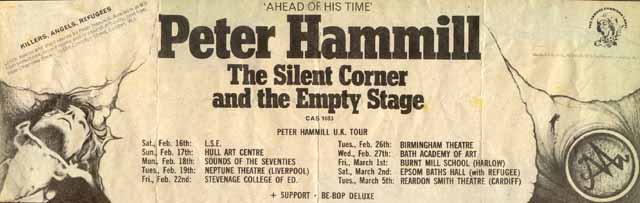I was acquainted with Nigel and Paul at Charisma and they knew I was interested in PH (I used to spend a lot of time between the Marquee and the Nelly Dean). As it was an important tour, they knew I would be up for putting the gig on, which was just far enough away from London to make it worthwhile. A school friend of mine, Mark Trotman, used to live next door to Peter Hammill's family in Derby and he had introduced us several years before. So at various gigs we'd spent a fair amount of time talking to him, we'd also corresponded through the post occasionally.