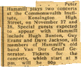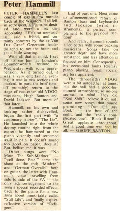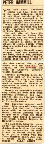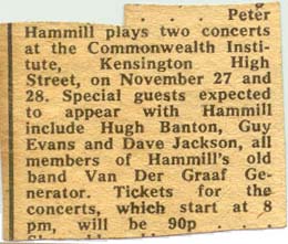 Last weekend I found some Hammill CDs in HMV for £3.99 and thought I would like to reactivate my interest after some 20-odd years. I also thought I'd re-read the article in Record Collector and therefore found myself checking out the sofasound website. And hereby lies the synchronicity, as it led me to check out your website which led me to. . . the poster from the Stevenage College gig in 1974. And I was the promoter of that gig (on behalf of the Student Union). I thought you may be interested to know a little more about that gig.