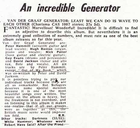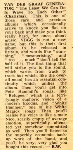 Now something about the band: Guy, Hugh and myself remain from the original four-piece Van der Graaf which broke up in July '69. We re-formed in October, with the addition of Nic and Dave, both of whom we had known for some time previously. We've had a lot of hassles and set-backs since getting together again, but we've survived, thanks to a lot of perserverence and some perversity. Thank you to all those who've helped us; those who gave us understanding, comfort, advice, generosity and love when we needed them most.....there are many, and the album belongs to them as much as us. I realise that I haven't really said anything at all.....Well, it's the last day of an old decade; tomorrow we can start anew.....I'm really only waving, a smile on my face and one tentative tear standing ready to fall....."