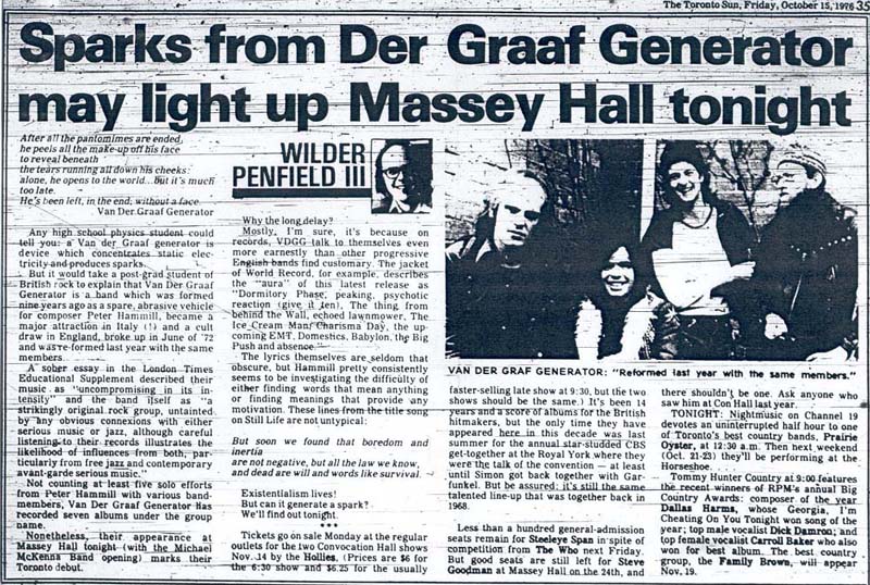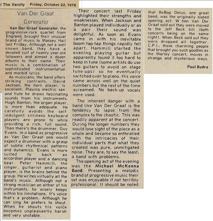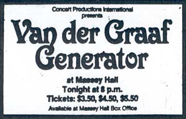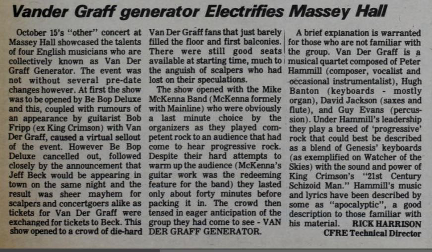 JC: Although they'd started out in the late 60s, VdGG had never played N America until you saw them in '76. How did you find out about the Toronto gig, and what do you remember of the vibe surrounding the gig.