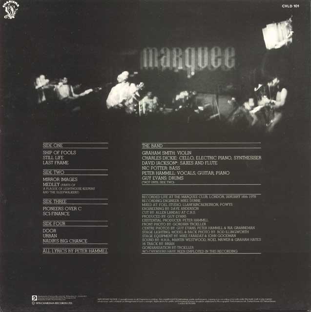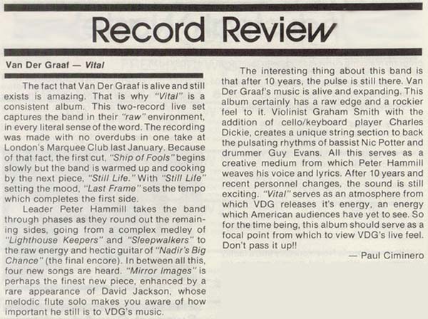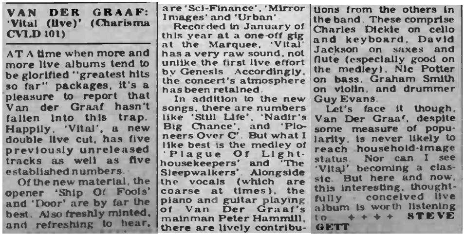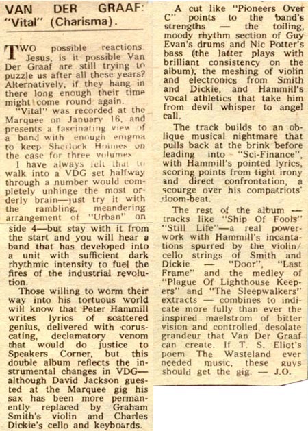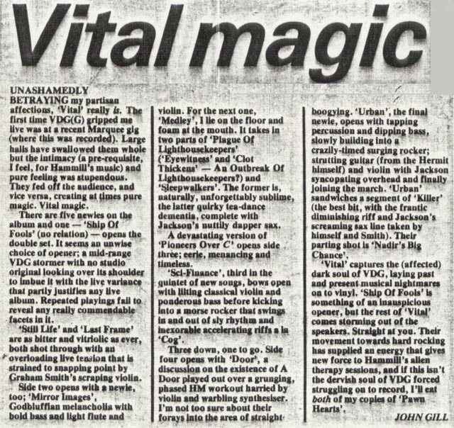 "I was working as a driver when I got a call from them to guest at two Marquee gigs to be recorded as a live album, by this time they had brought in Charles Dickie on cello. The finished album, Vital, is a personal disaster for me, I can't bear to hear it. Usually I would have wanted 4 tracks of the 24 track mobile they set up, 2 because of the stereo nature of my saxophone set-up and two for the effects pedal etc. on each channel.
