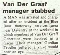 | "Another incident from their troubled road life occured when travelling home late one night during the UK tour. Whilst at a service station a whiskey drinking and very strong individual slashed at Gordian with a plastic knife. He was eventually subdued by four roadies".