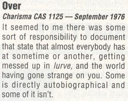 | "Over is a stunning piece of verbal open-heart surgery, served well by its haunting musical settings." - Review of the CD in Goldmine (Michael P. Dawson, 7th March 1992) |