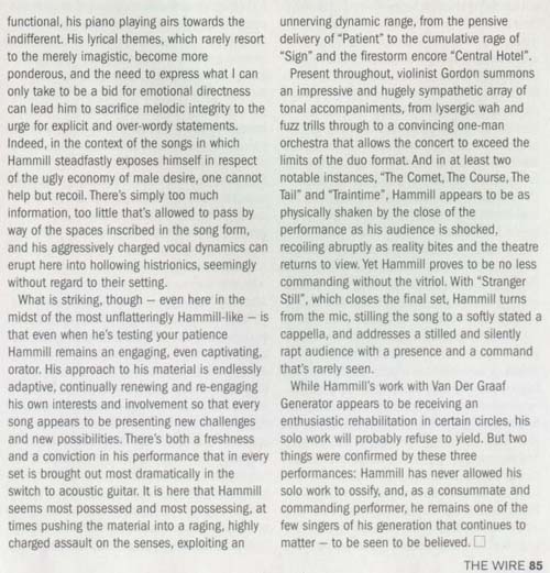 Peter Hammill recently performed at the Hammersmith Lyric in London - three shows - one on Friday the 14th June 2002 and two on Saturday the 15th June. He was accompanied by Stuart Gordon on violin.