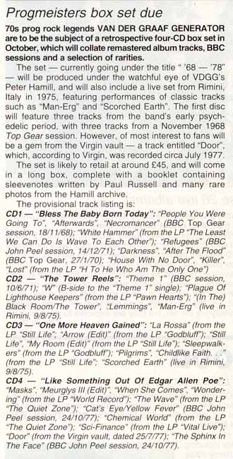 | Progmeisters Box Set Due in October 2000 - from Record Collector Magazine article. | |